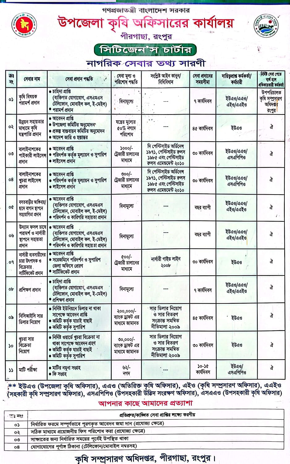 ১। সকল শ্রেণীর কৃষকদের চাহিদা ভিত্তিক সেবা প্রদান ।